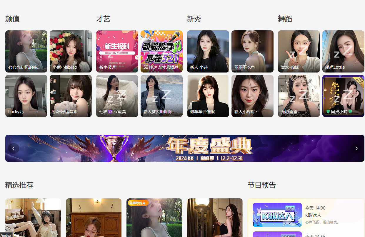 直接访问 类似网站 KK直播 - 视频直播交友平台 站点名称: KK直播 网址链接: https://www.kktv5.com/ 网站打分: 网站语言: 简体中文 所属分类: 直播交友 收录时间: 2024年12月16日 站长QQ: 暂无 累计点击: 329人次 编辑人员: 导航天下 百度权重: 搜狗权重: SEO查询: 立即查看 网站介绍 KK直播是一个聚集高颜值才艺达人、网红主播的视频直播交友平台。这里有24小时精彩不间断的女神直播、才艺直播、户外直播、派对交友、情感陪伴、游戏陪玩,随时随地与美女帅哥零距离接触! 网站标签 KK, KK直播, KK直播官网, 美女直播, 视频直播, 聊天交友, 高颜值, 好声音, 娱乐美女, KK年度盛典, 互动直播 人气走势